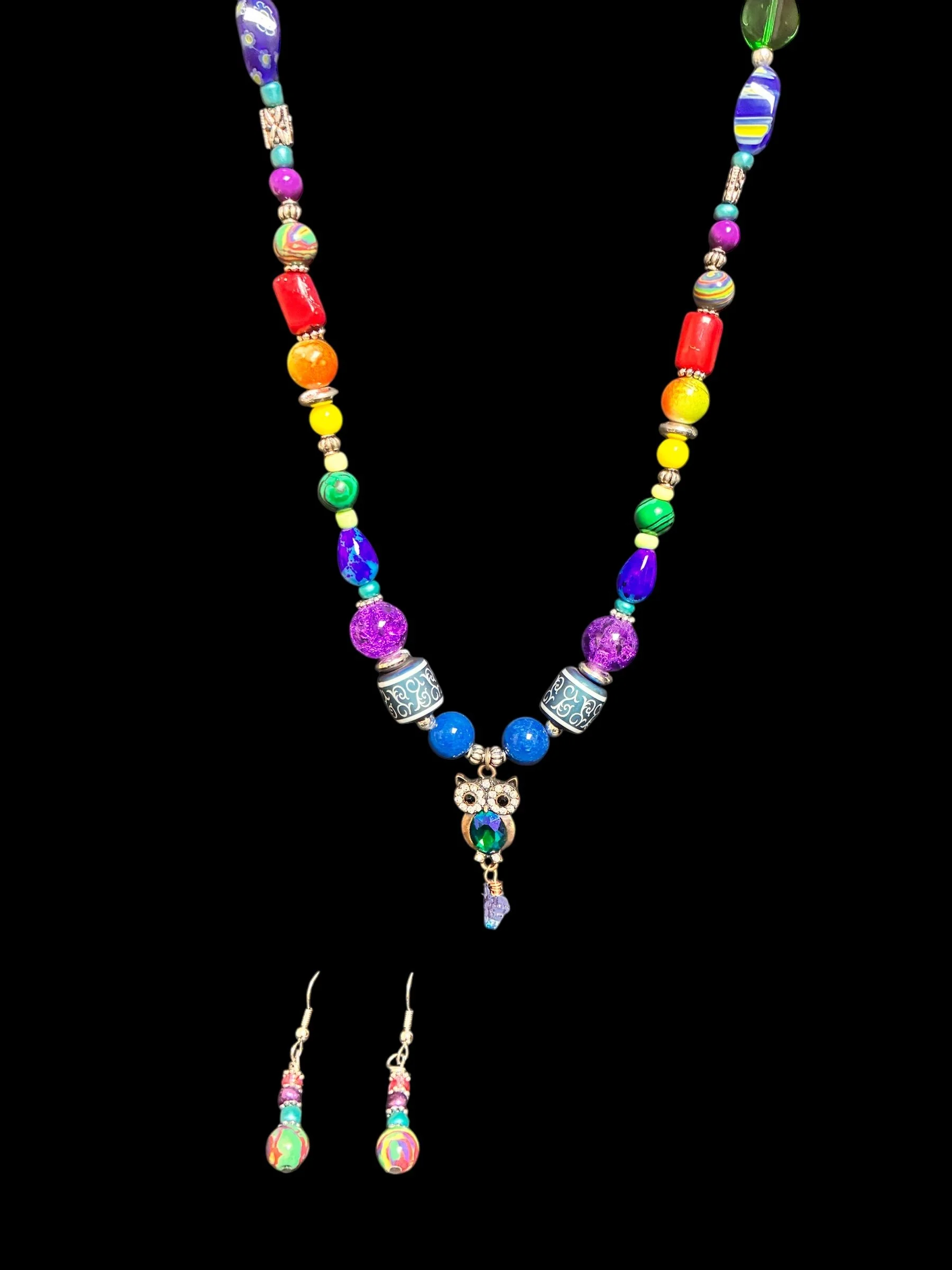 The colors of the rainbow and a cute little owl… colorful beads (a few are vintage beads) and matching earrings